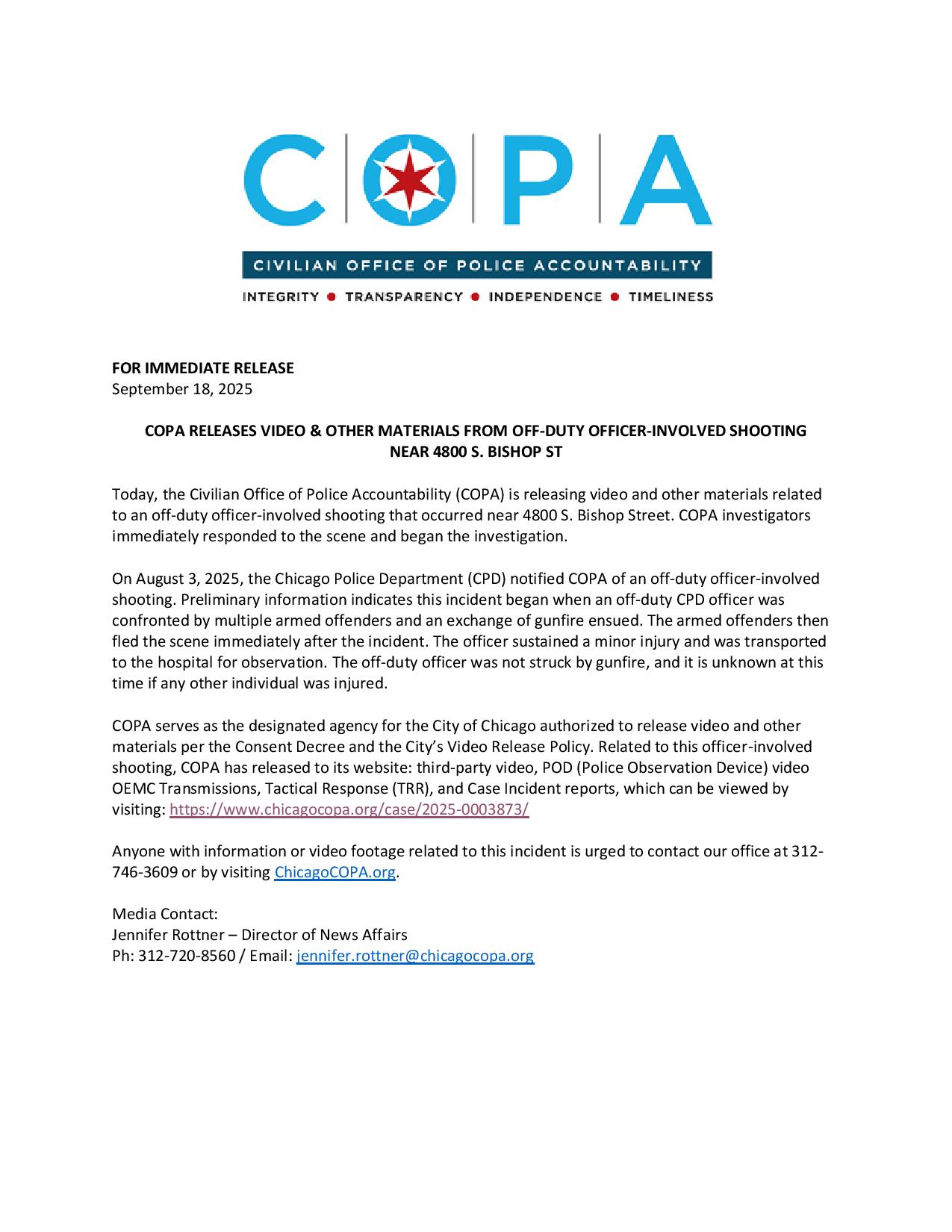 This post includes all relevant video, audio, and Chicago Police Department records in COPA’s possession that are required to be released related to the use of force in this off-duty officer-involved shooting and the events immediately following it.