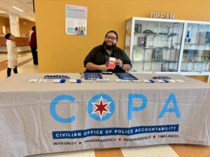 COPA had a great time attending the Acero Carlos Fuentes Report Card Pick Up in the Belmont Cragin community. The report card pick up day included a resource fair component to connect families to local resources. COPA was able to set up a resource table and give out information on our role in police accountability.